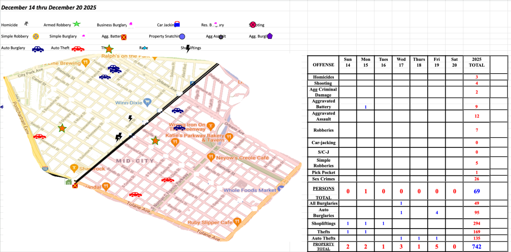 It should be noted there were several arrests made in the late night of 12/19/25 and early morning hours of 12/20/25 related to the vehicle burglaries that occurred in Mid-City. The perpetrators were also connected to vehicle burglaries in the City Park Neighborhood.