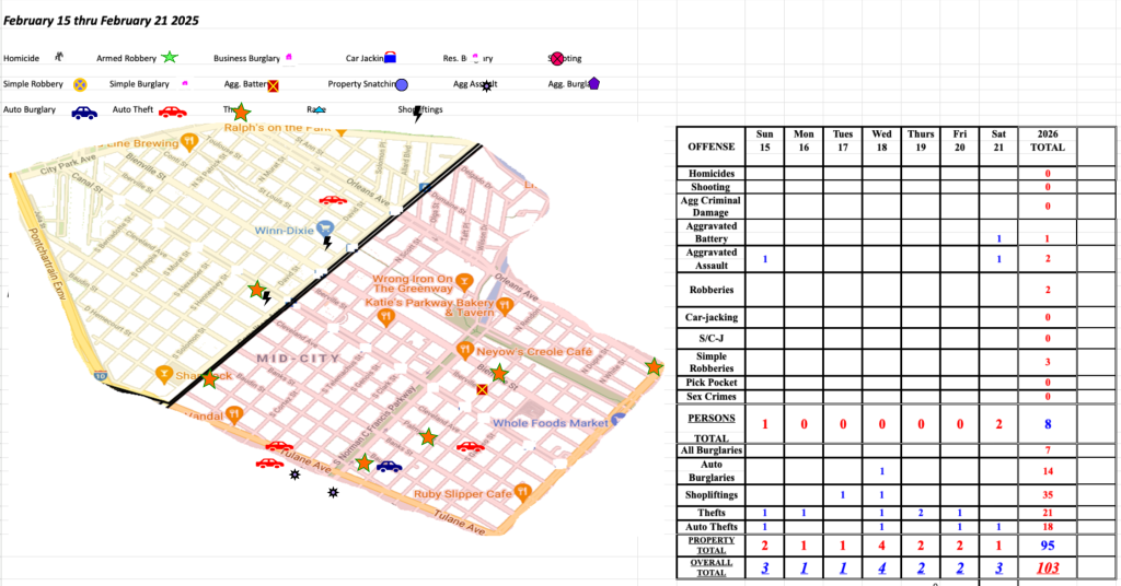 Item # B-14105-26 2/15/26 1:35 am 3219 Tulane Avenue aggravated assault; There was a physical fight inside the Hookah Bar, after the altercation the involved parties re-engaged with the perpetrator pointing a handgun at the victim and striking her with the weapon. Benjamin Locure B/M 11/21/94 was arrested for the incident days later.