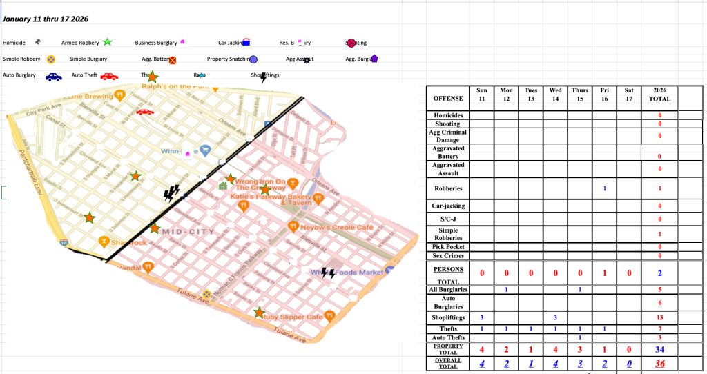 That’s pretty good map showing less crimes in the Mid-City area. But we need prevent burglaries, shopliftings, & arsons. Lets make NOLA the safest city for a long period of time and before the actual Mardi Gras week.