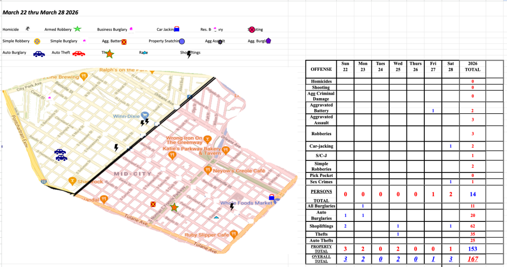 Item # C-26748-26 3/27/28 3:30 pm aggravated battery @336 S. Norman Francis Parkway;  The victim went outside to confront a next-door neighbor about yelling and profanity.  The incident escalated to a physical fight, an unloaded gun was retrieved by the perpetrator and the perpetrator hit the victim in the face several times with a child foot scooter.  The victim had to be treated for facial injuries.  The perpetrator fled the area after the incident and doesn’t appear to be a tenant known to the property owner.  As of this time he’s not been identified by name, but I expect he will be soon.  I will share that information as soon as DIU confirms.