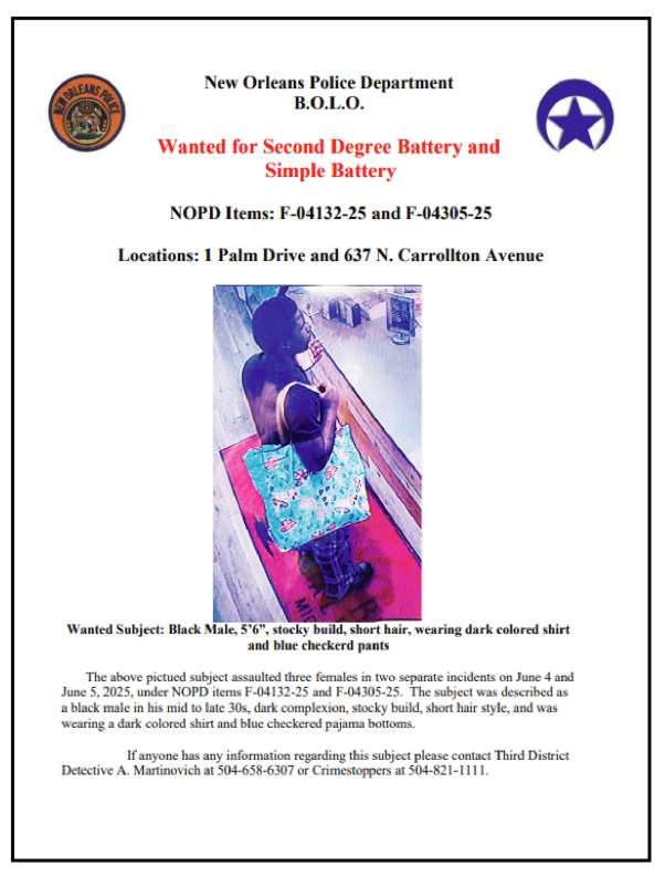 Item # B-24617-26 2/25/26 12:15 am Canal and City Park Avenue *car-jacking*; The victims, driver and front passenger, where at the red light waiting for the left turn to enter the interstate, when the vehicle was approached by a black male wearing a ski mask, armed with a handgun, wearing a black hoodie, sweatpants, and…
